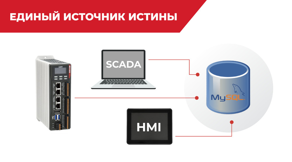 Архитектура Optimus Drive, основанная на CoDeSys или DIADesigner-AX, даёт возможность реализовать единую базу данных состояния благодаря OD MySQL. Все системы (контроллер, SCADA, HMI-панель оператора) обращаются к одному источнику, что значительно снижает количество возможный ошибок.