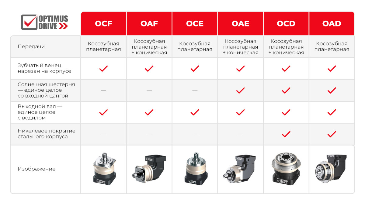 Безусловным хитом (лидером продаж) среди ассортиментной линейки Optimus Drive стала серия OCF. Соосные планетарные редукторы этой серии имеют: